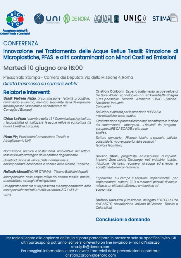 La conferenza “Innovazione nel Trattamento delle Acque Reflue Tessili: rimozione di microplastiche, PFAS e altri contaminanti con minori costi ed emissioni” vedrà protagonista anche Elisabetta Scaglia (Servizio Ambiente UNIC – Concerie Italiane) che presenterà un intervento di approfondimento dal titolo “Settore conciario – risorse idriche e scarichi: attività consolidate, nuove opportunità e ostacoli (tecnici e legislativi)”.